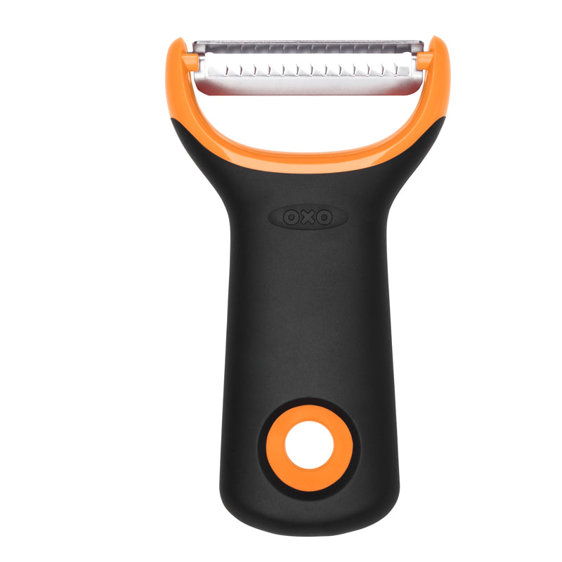 Julienne Peeler, 4.25"/10.5cm of rustproof stainless steel magnificence! Slices through fruits and veggies so you can create impressive strips with ease. Sharpened to perfection with Japanese stainless steel, plus an ergonomic handle and slim design - fits comfortably in your hand and won't take up much space in the drawer! Our OXO signature grip never slips, no matter how wet it gets.