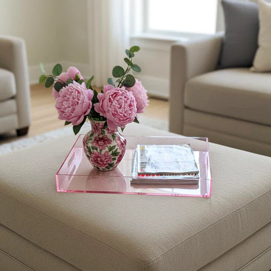 This elegant pink lucite tray combines form and function with its transparent acrylic construction and convenient handles. Perfect for serving beverages and appetizers, organizing tabletop essentials, or displaying decorative items, its sophisticated hue complements both modern and traditional interiors. The durable lucite material resists staining and cleans effortlessly, making it ideal for everyday use or special entertaining. A versatile accent piece that elevates any room's aesthetic while delivering practical utility.