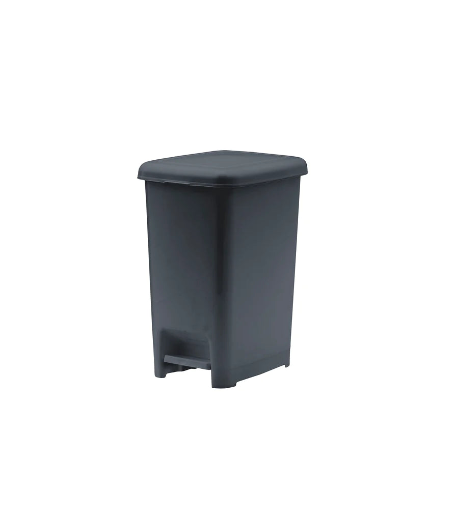 This Onyx Grey Slim Pedal Trash Can features a sleek design ideal for use in tight spaces, such as between cabinets. Its hands-free step-on feature ensures that your hands remain clean while disposing waste. With a sturdy plastic build and a bucket handle to keep bags from slipping, this trash can is easy to maintain and comes in various sizes and colors. Dimensions are 12" x 16.5" x 21".
