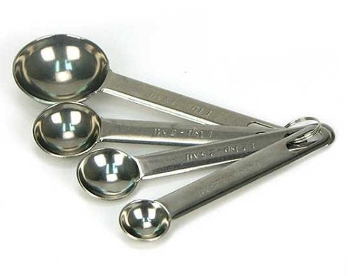Use with dry and liquid ingredients; rounded bowls are easy to fill, Precision manufactured, the set includes spoons for 1/4 tspn., 1/2 tspn., 1 tspn., and 1 tablespoon, all held together on a key ring. This set nests for easy storage.
