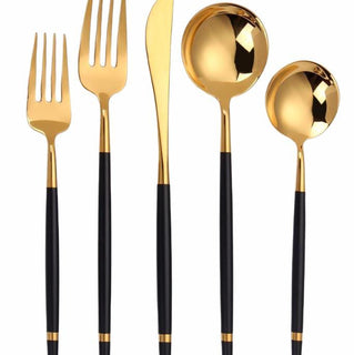 Vikko Dine - Oak, Mirror Gold And Black, 18/10 Flatware, 20 Pc Set, Service For 4 This set of Vikko Dine Mirror Gold & Black Oak Flatware includes 20 pieces, perfectly suited to serve 4 people. The premium 18/10 stainless steel ensures durability and longevity, making it a great investment for all your dining needs.