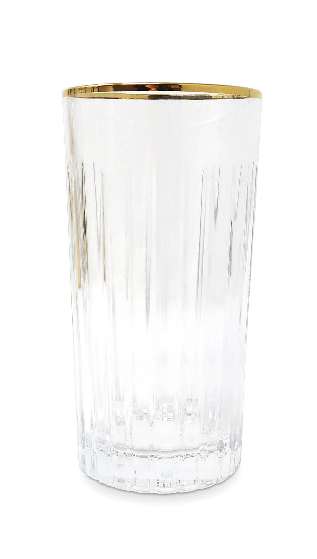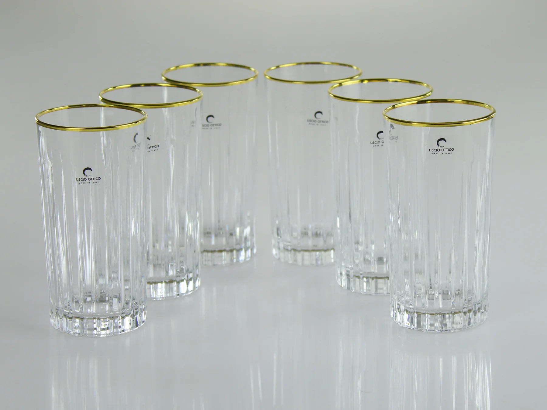Elevate your drinking experience with Vivience Gold Highball Glasses. The Liscio Ottico Collection features intricately crafted glasses with a linear design and gold rim. Each glass offers a secure grip and comfort hold, while their quality materials ensure durability for daily use. Impress your guests with this stunning set, measuring 3"D x 6"H and holding 15 oz.