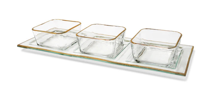 Expertly crafted and elegantly designed, the Vivience Gold Relish Bowl Set elevates any dining experience. Made of high quality glass, this 3-piece set features a stunning gold rim that adds a touch of sophistication. Perfect for serving appetizers, dips, and condiments, this relish dish set is a must-have for any host or hostess.