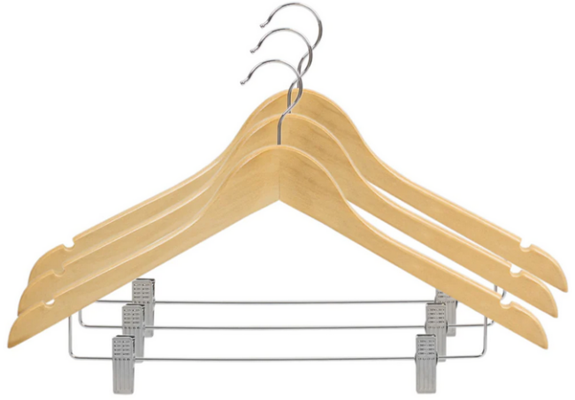 Preserve your delicate garments with these natural wooden hangers featuring integrated skirt clips. This three-piece set combines timeless craftsmanship with practical functionality, offering secure grip for skirts, pants, and lightweight fabrics without creasing or slipping. The smooth, natural wood finish complements any closet aesthetic while the sturdy construction ensures long-lasting durability. Ideal for organizing and protecting your wardrobe essentials with professional-grade care.